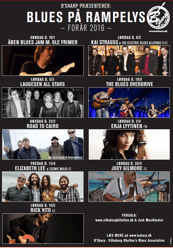 B’ Sharp i Silkeborg har netop annonceret deres koncertprogram for foråret 2016. Der bliver både plads til lokale, nationale og internationale bluesnavne. Blandt andet spiller tyske Kai Strauss & The Electric Blues Allstars den 6. februar. Finske Erja Lyytinen 2. april og amerikanske Rick Vito 14. maj. Der lægges ud med åben jamsession den 10. januar hvor Ole Frimer er vært.